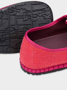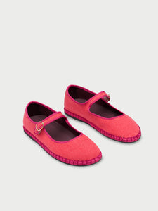 • Linen Mary Jane in pink with pink piping and buckle closure.