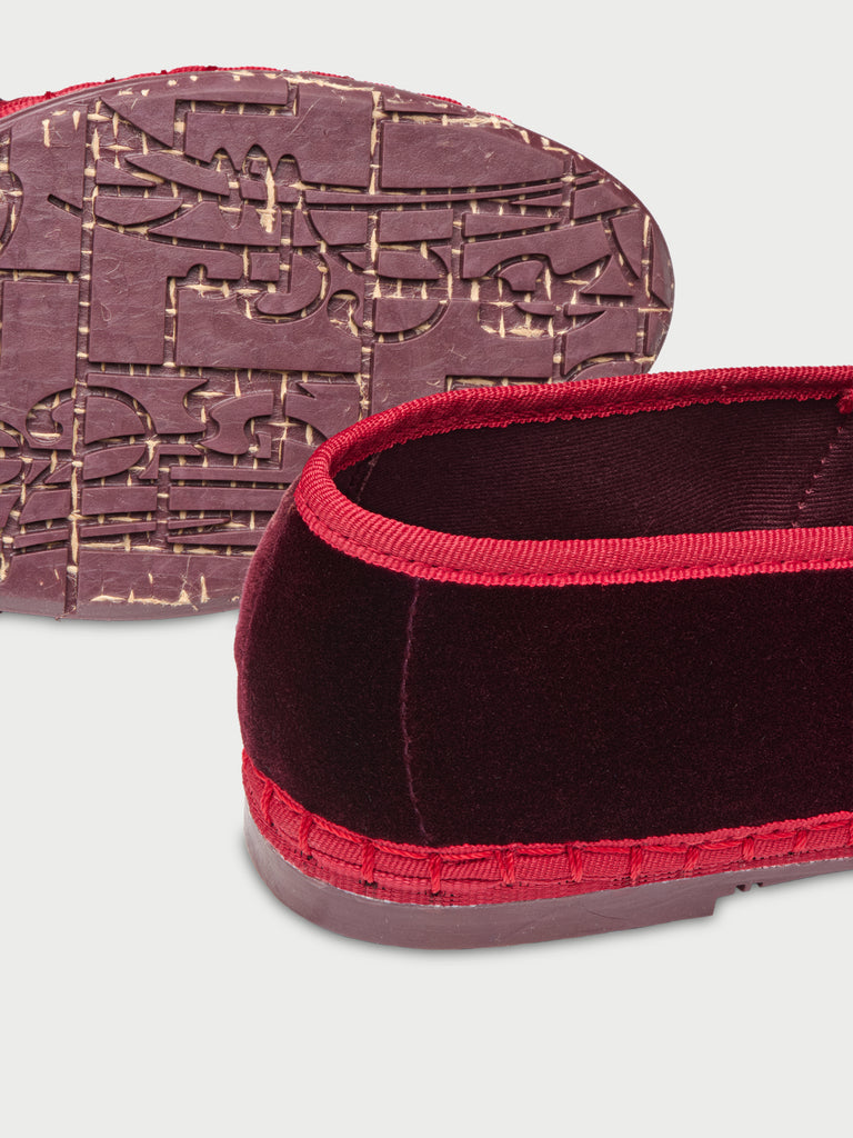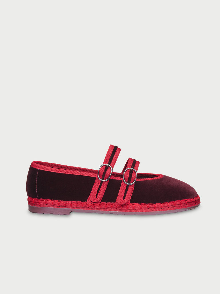 • Velvet mary jane in garnet with red piping and double red velvet straps with buckle as closure.