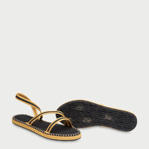 • 2cm high flatform sandal with straps trimmed in black & yellow. Elastic strap that grips the ankle.