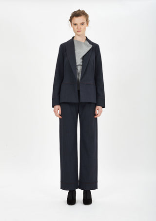 • Navy blue straight long pants with waistband, belt loops, side pockets and a welt pocket in back right side.