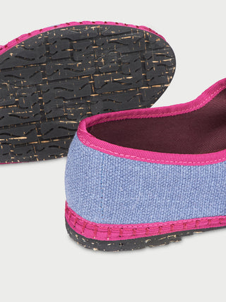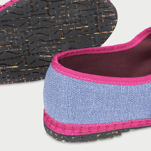 • Linen mary jane in denim blue with pink piping and buckle closure.