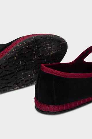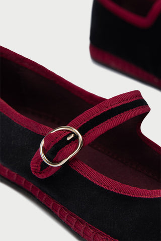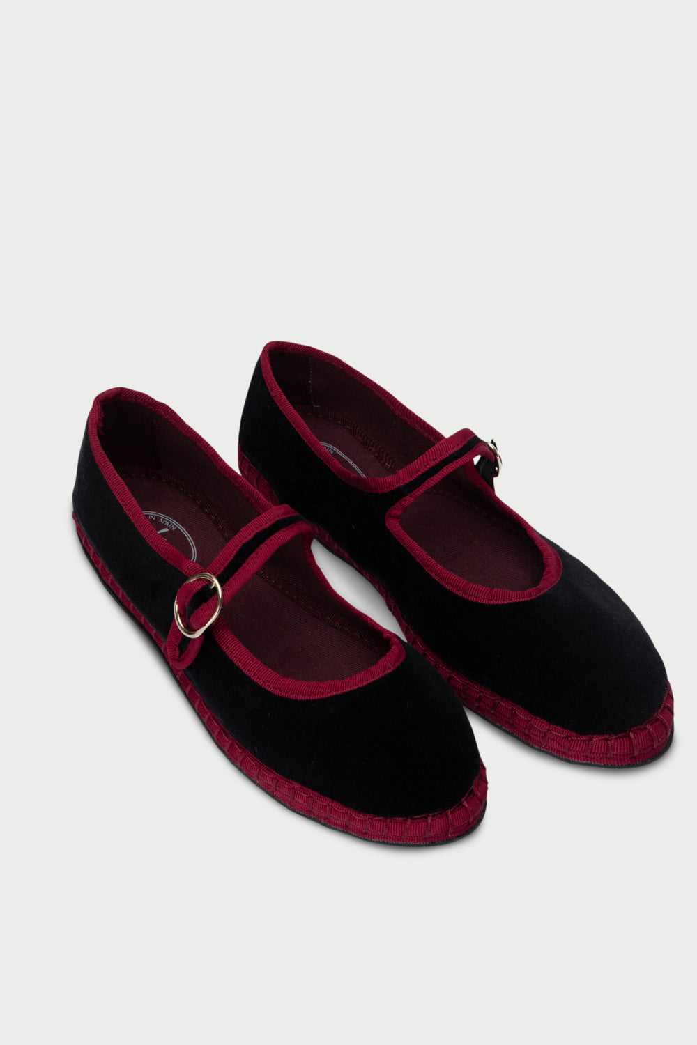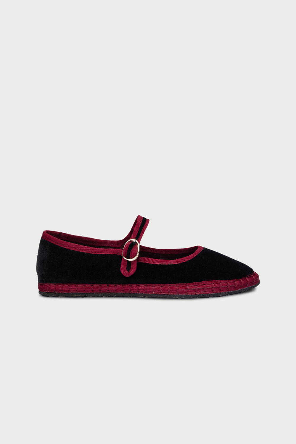 • Velvet mary jane in navy blue with red piping and buckle closure.