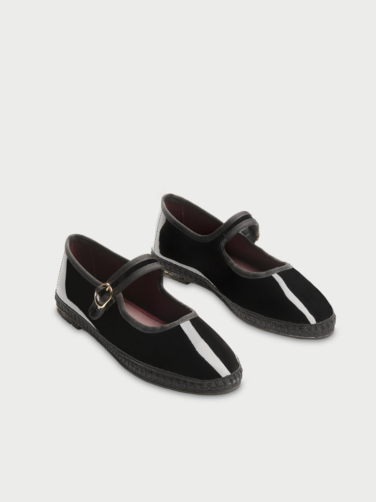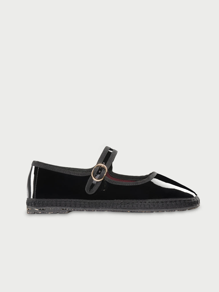 • Patent leather mary jane in black with black piping and buckle closure.