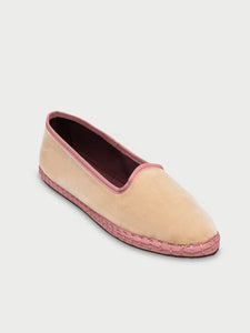 • Velvet slipper in beige with light pink piping.