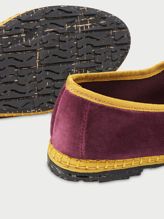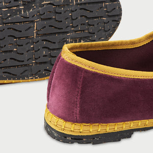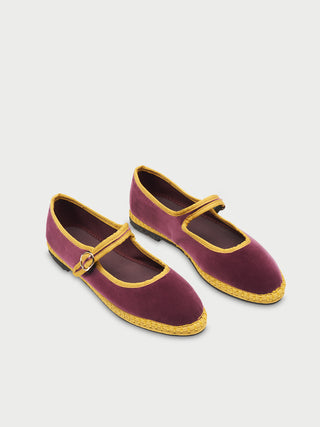 • Velvet mary jane in burgundy with yellow piping and buckle closure.