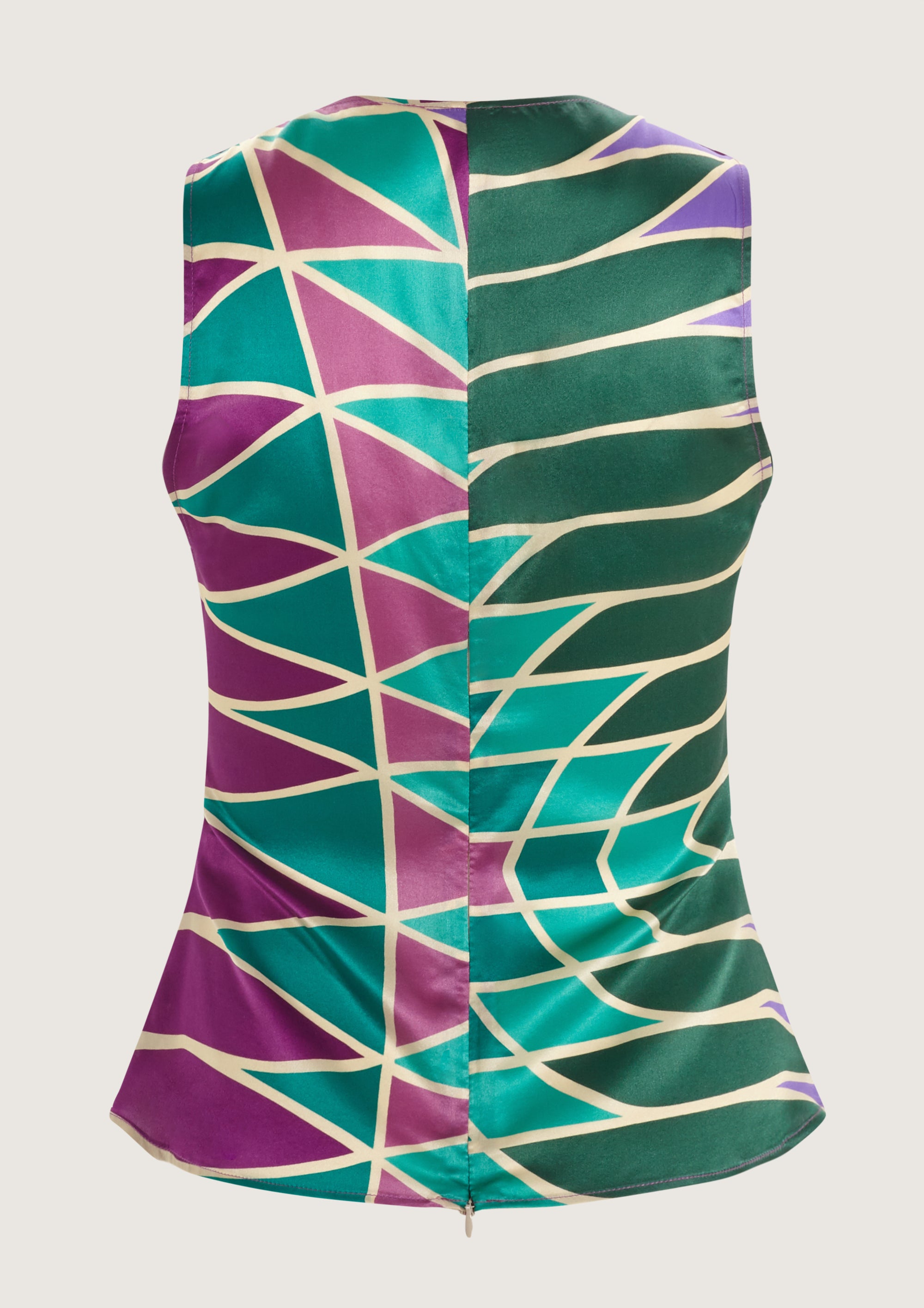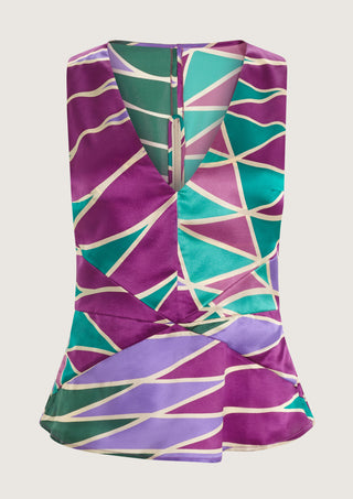 • Purple & green v-shape neckline sleevless top.Cut-outs in front.