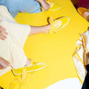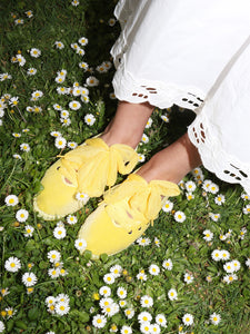 • Velvet slipper in yellow with yellow piping and yellow tulle laces as closure.