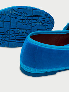 • Velvet mary jane in blue with blue piping and buckle closure.