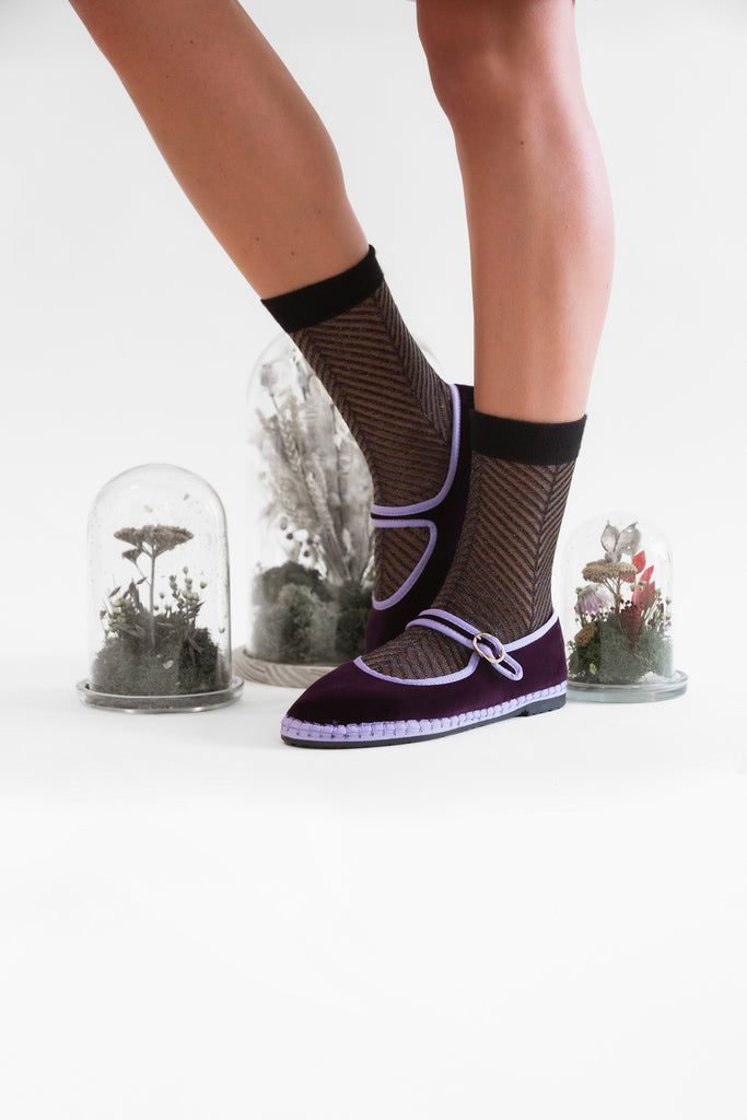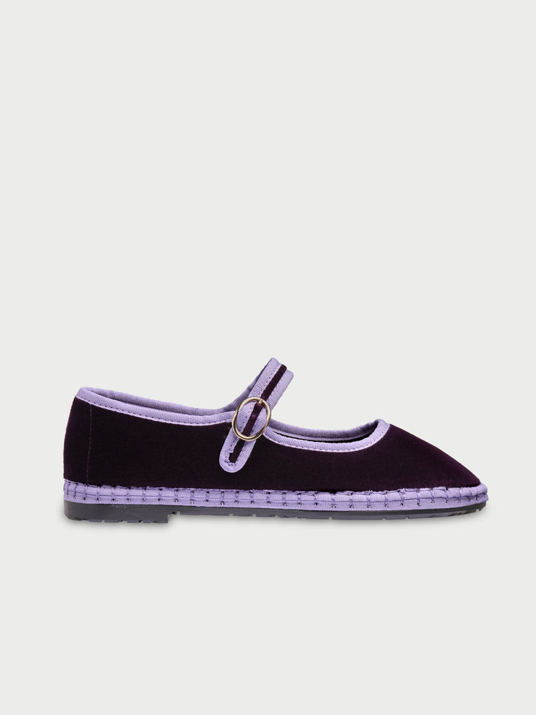 • Velvet mary jane in aubergine with light purple piping and buckle closure.