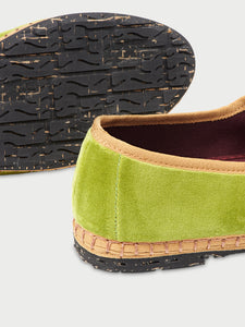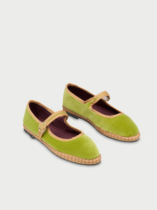 • Velvet mary jane in light green with light beige piping and buckle closure.