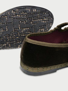 • Two strap velvet Mary Jane in dark brown with khaki piping and a fake buckle.