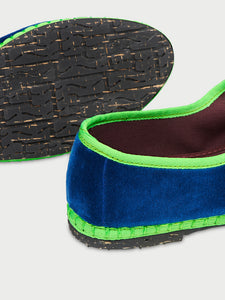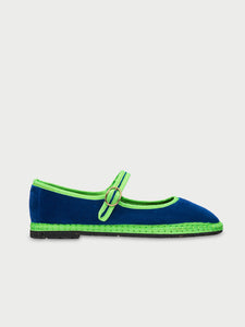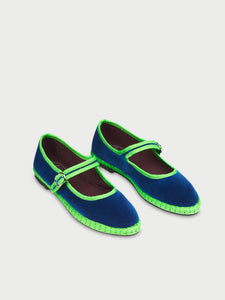• Velvet mary jane in dark blue with neon green piping and buckle closure.