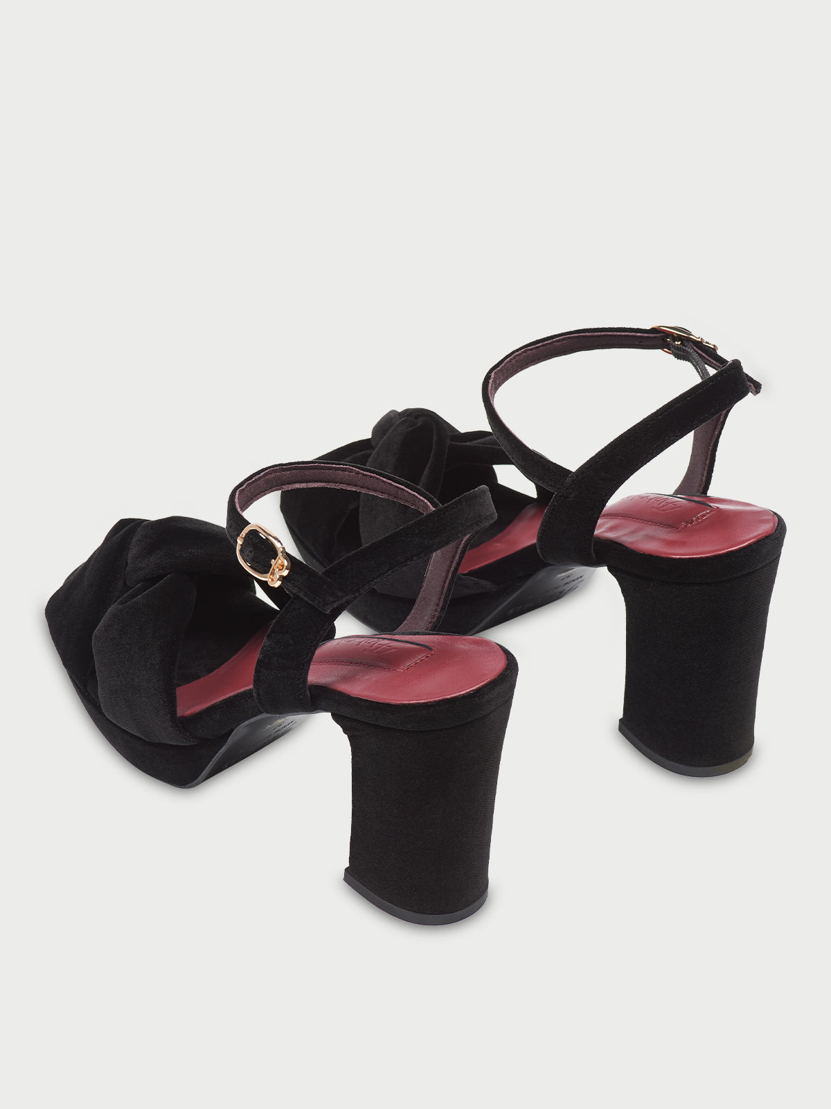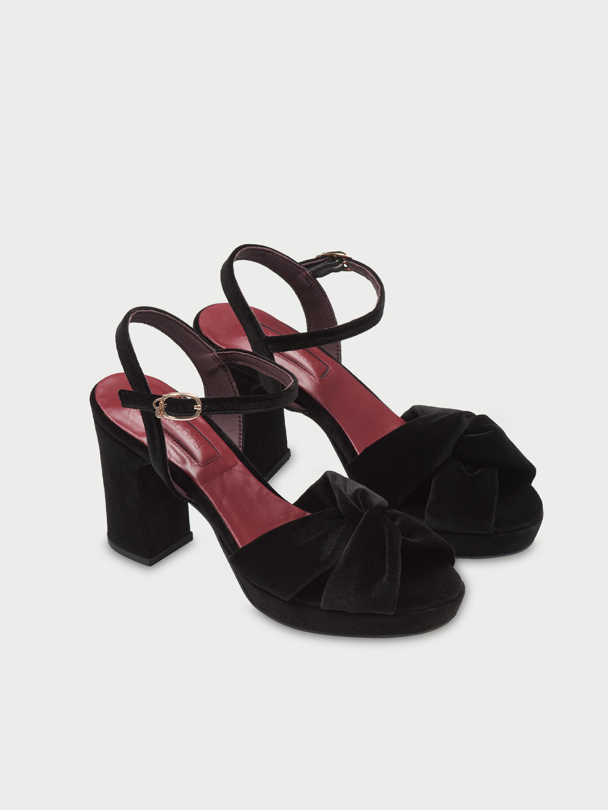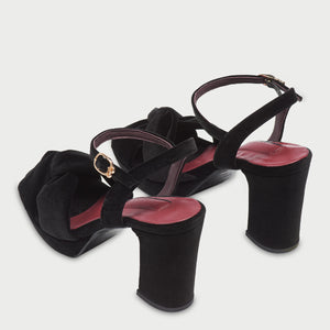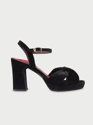 • Black velvet heel sandal with ankle strap and buckle fastening with Flabelus’ logo detail.