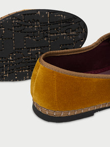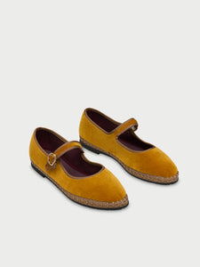 • Velvet Mary Jane in mustard with brown piping and buckle closure.