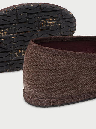• Brown aged linen moccasins with brown piping.