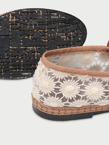 • Mesh ballerina v-hole in flower printed mesh with beige piping.