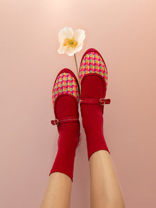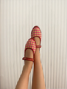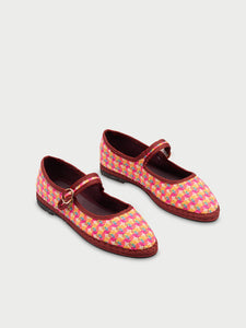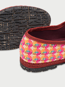 • Raffia mary jane in multicolor with red piping and buckle closure.