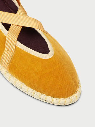 • Velvet slipper in dark yellow with light yellow piping and yellow laces.