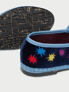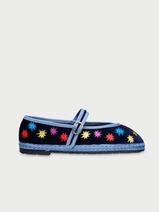 • Velvet Mary Jane in navy blue with light blue piping and buckle closure with embroidery.