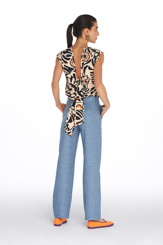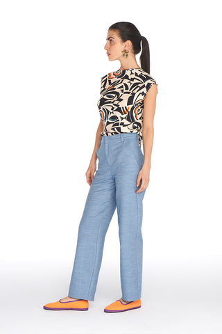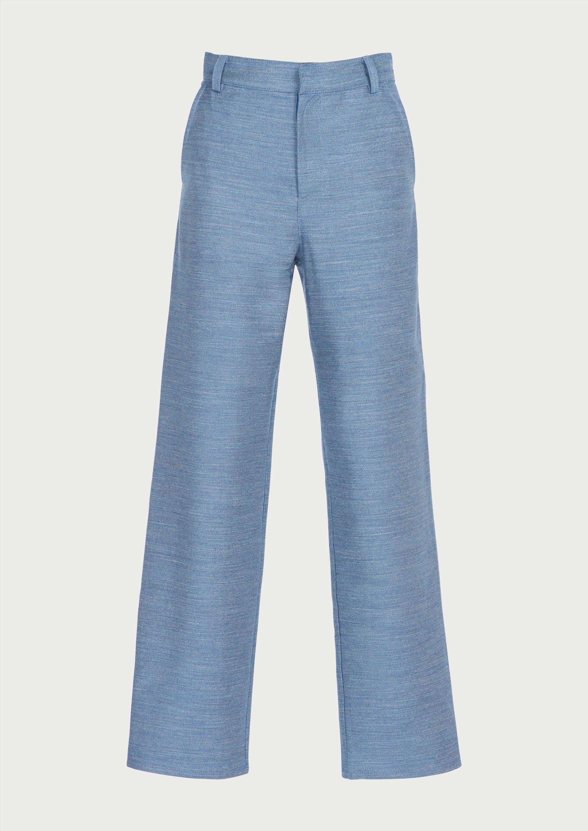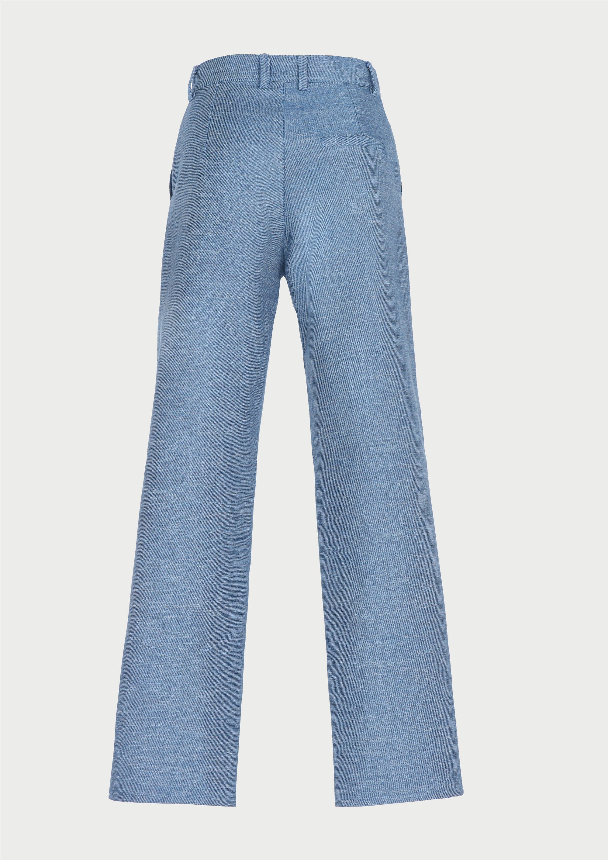 • Light blue straight long pants with waistband, belt loops, side pockets and a patch pocket in back right side.