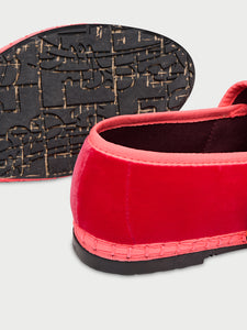 • Velvet mary jane in red with pink piping and heart buckle closure.