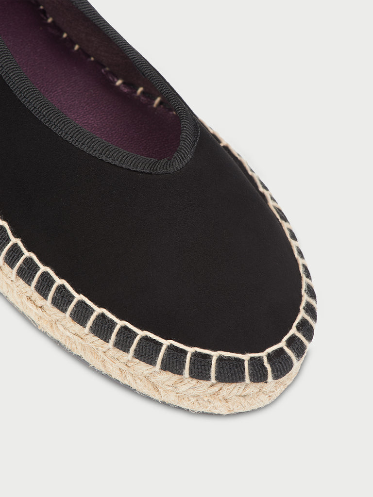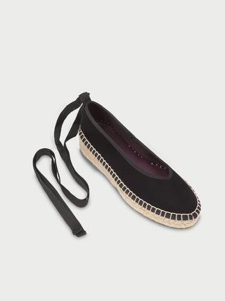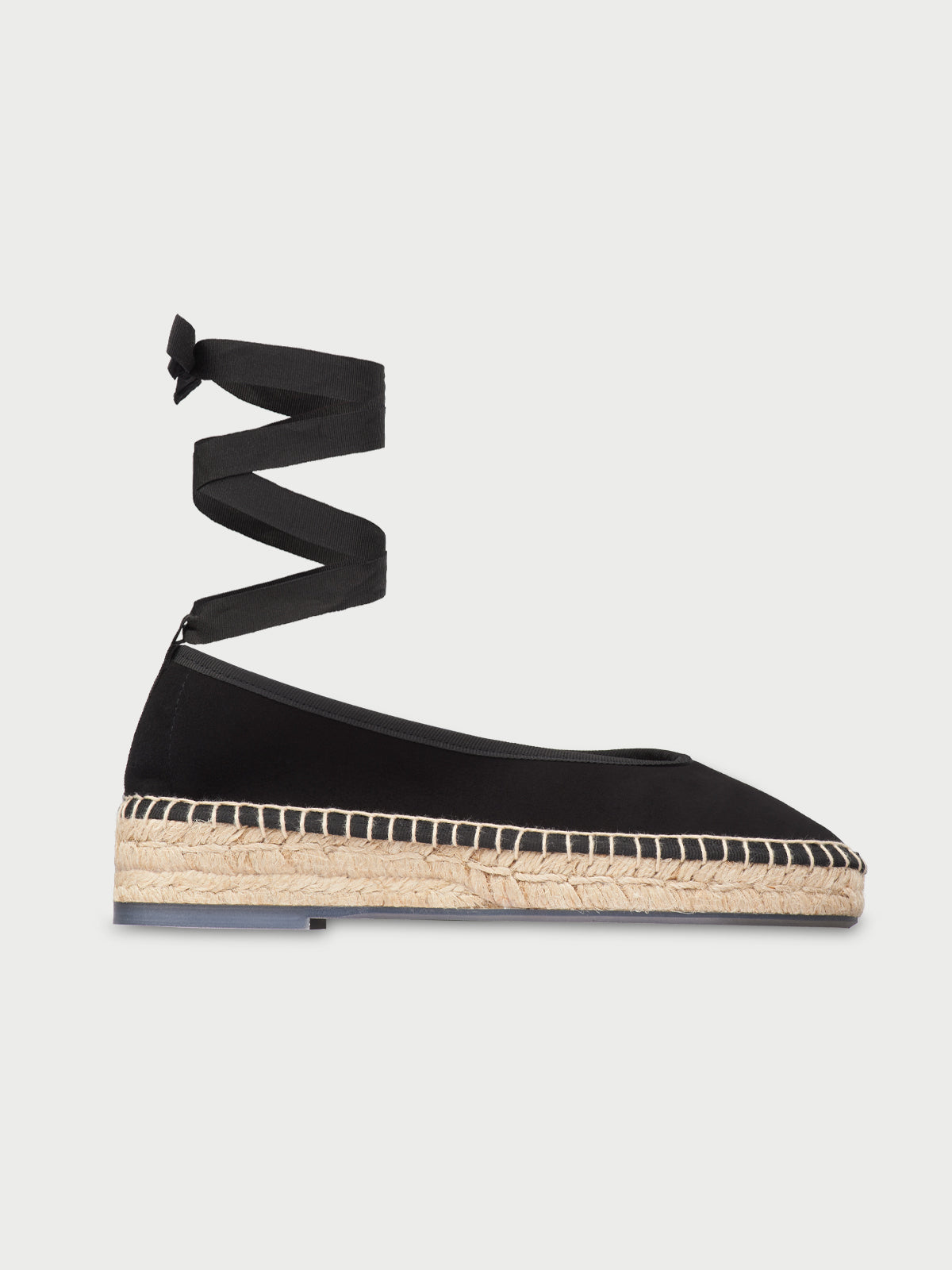 • Suede ballerina in black with black piping and black laces. Natural jute sole.