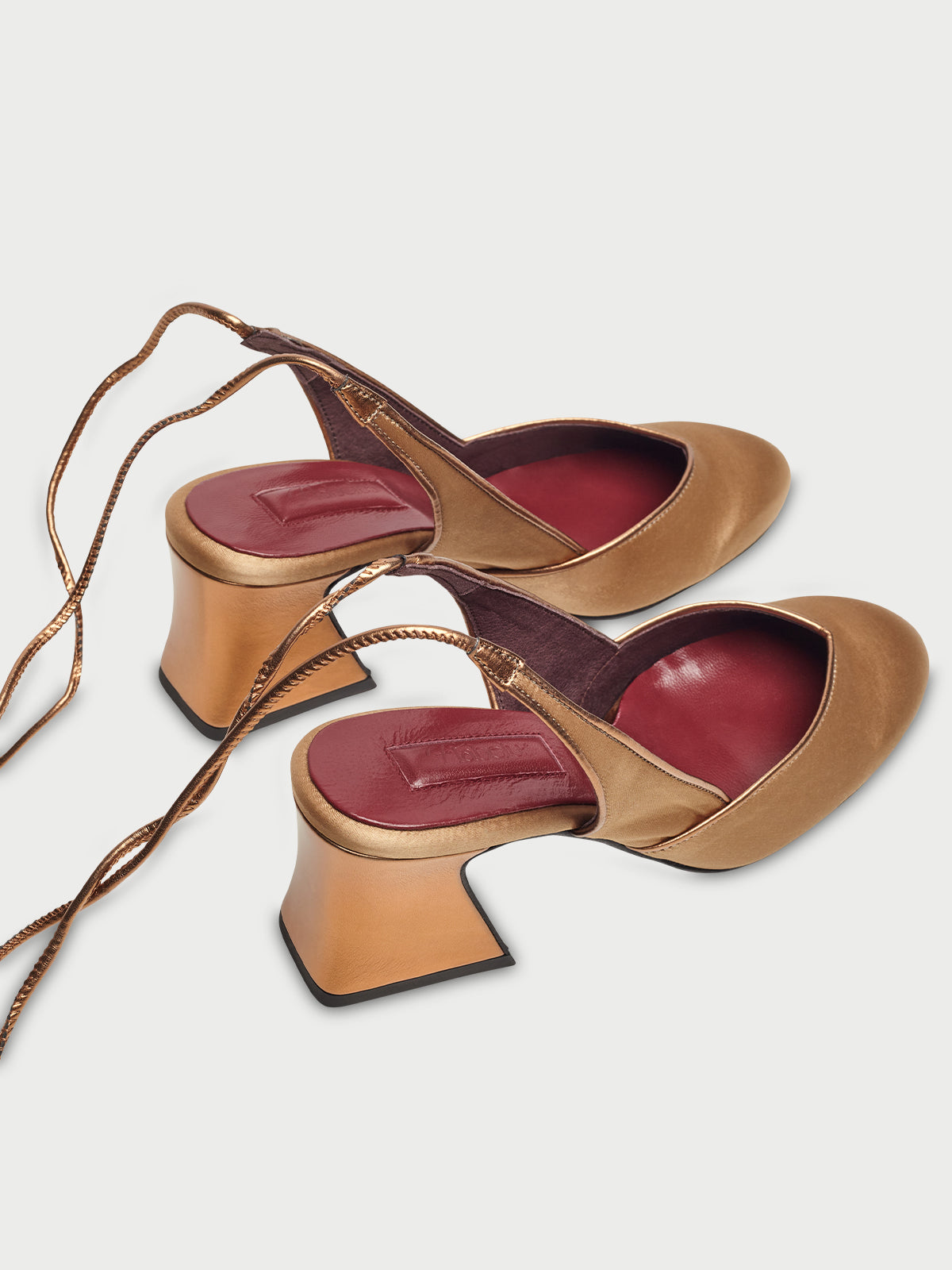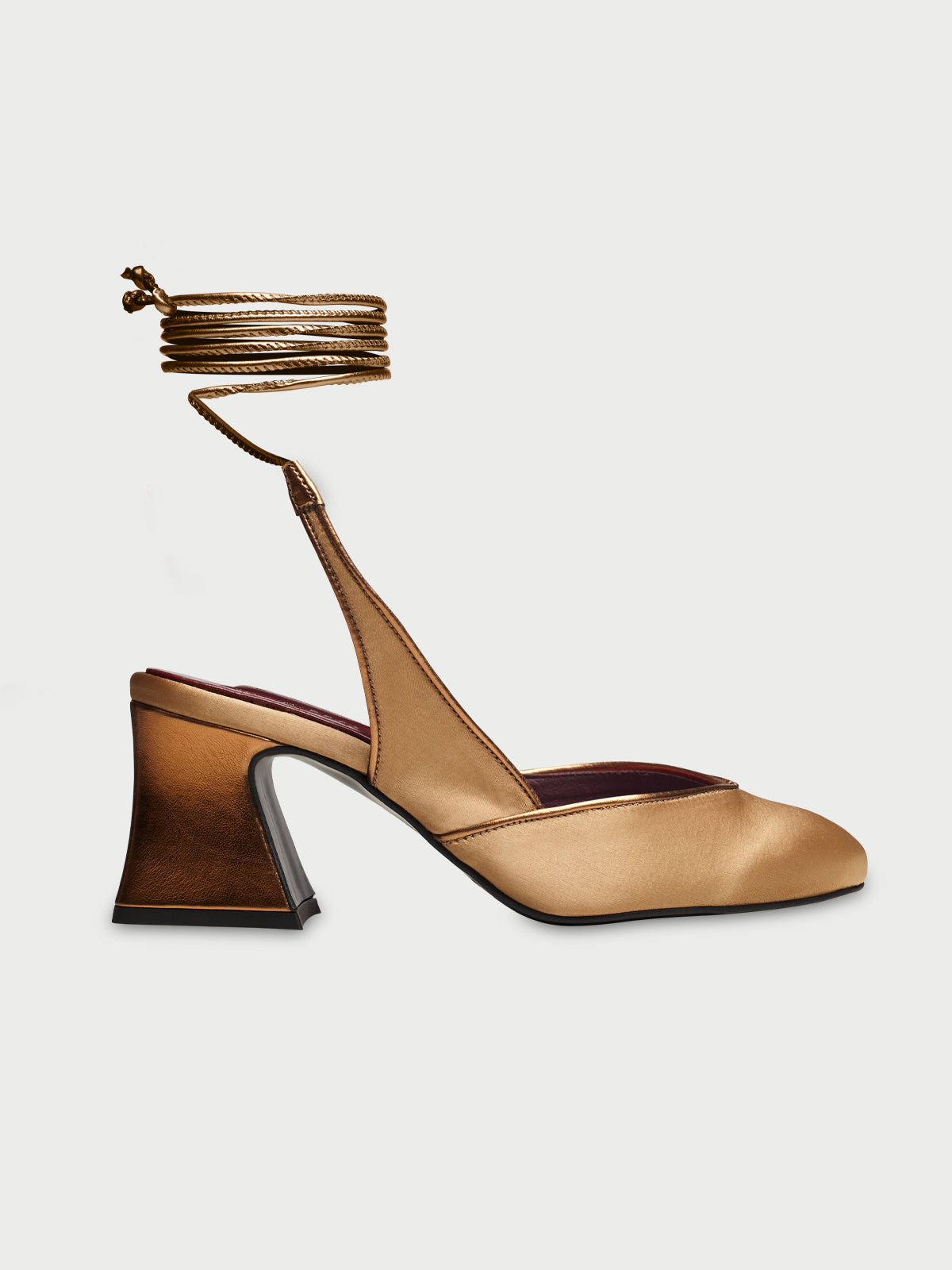• Brown satin heels with v-shaped neckline finished with thin laces tied to the ankle.