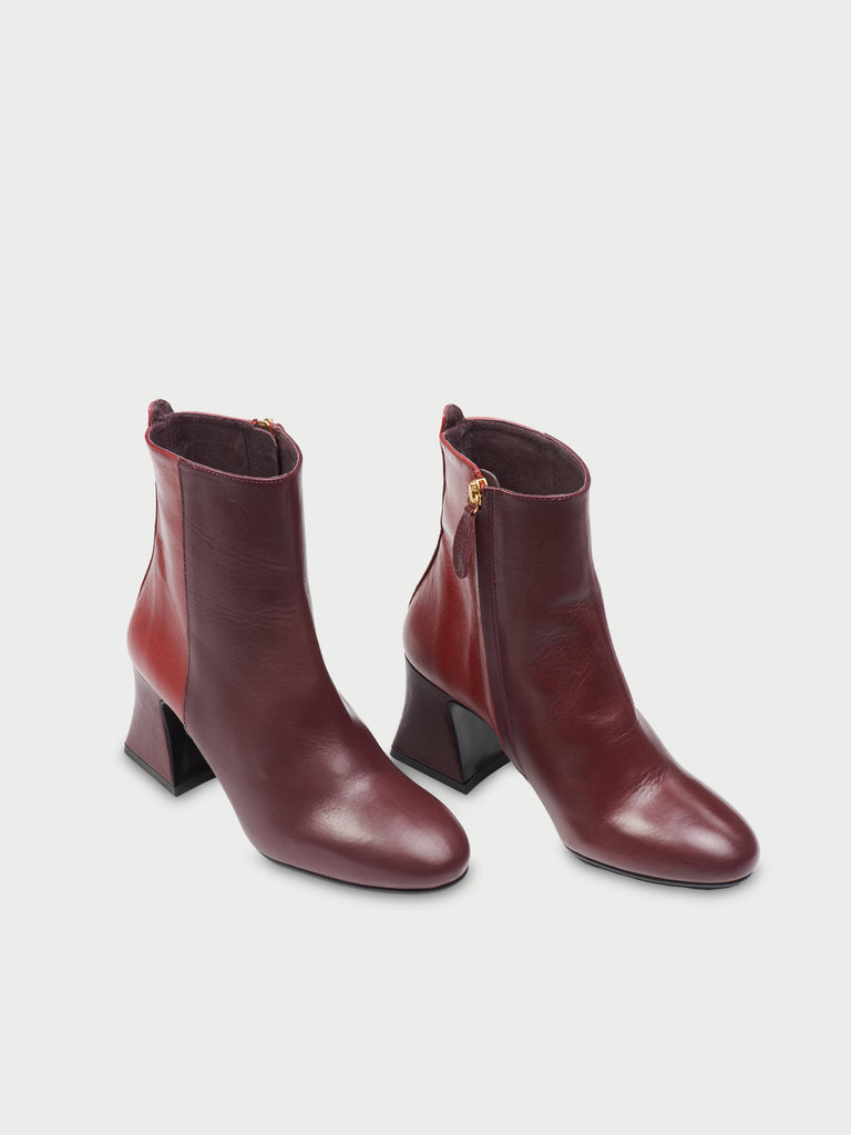 • Two-tone burgundy leather ankle boot with zipper and personalized leather puller. Heels are 6cm high.