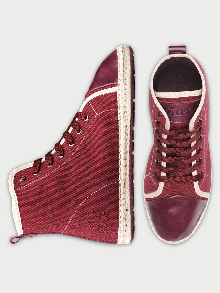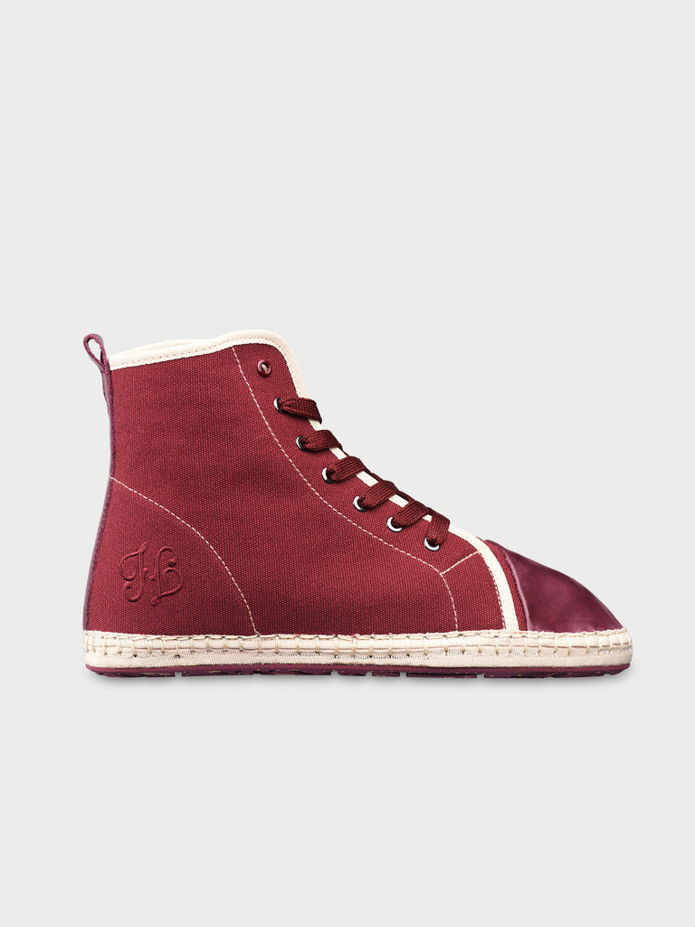 • Burgundy linen lace-up flatform ankle boot with beige piping & burgundy leather toe cap and details.