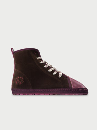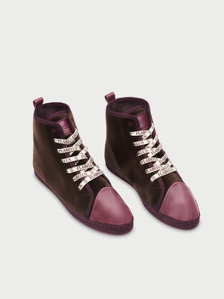 • Brown cotton velvet lace-up flatform ankle boot with burgundy piping & burgundy leather toe cap and details.