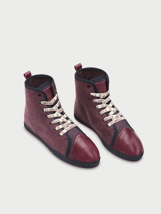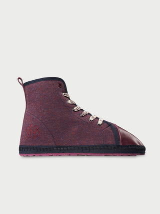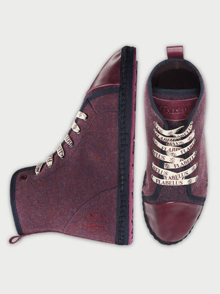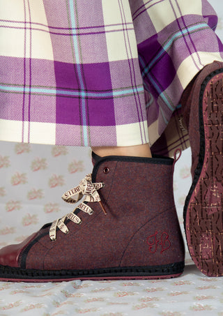 • Purple felt lace-up flatform ankle boot with negro piping & burgundy leather toe cap and details.