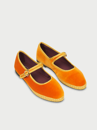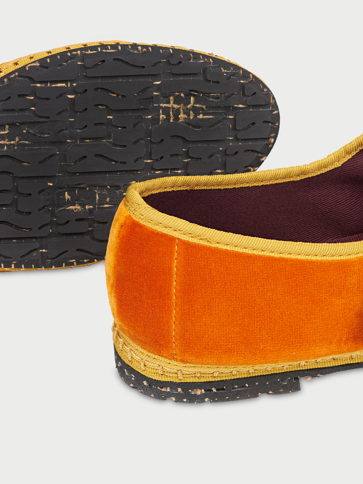 • Velvet mary jane in orange with yellow piping and buckle closure.